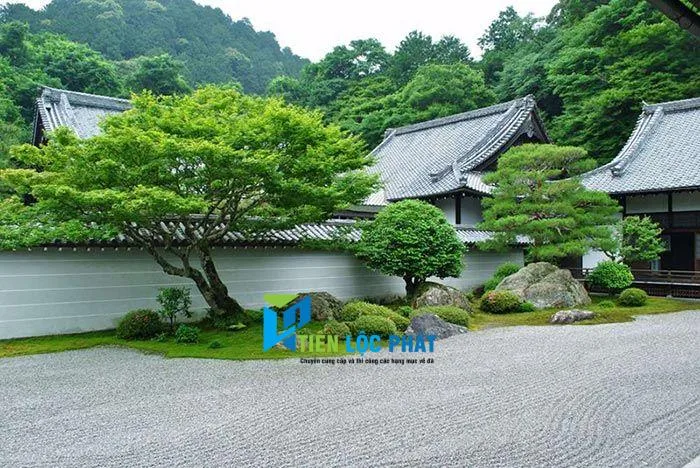 Đá cuội, sỏi nhỏ và đá phiến là các vật liệu chủ đạo trong thiết kế sân vườn kiểu Nhật. Đá tạo nên vẻ tĩnh lặng và thiền định, giúp không gian trở nên thư giãn, hòa quyện với thiên nhiên.
