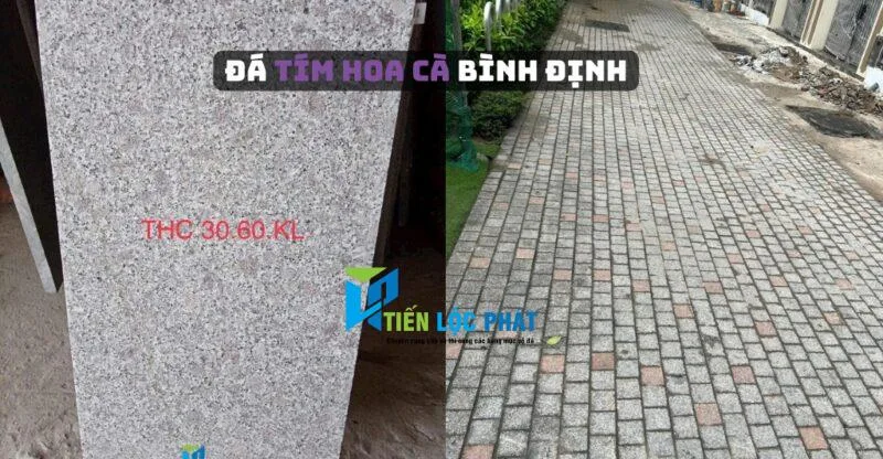 - Đặc điểm: Đá tím hoa cà là loại đá có màu hoa cà được khai thác ở vùng đất Bình Định. Với điều kiện thời tiết nắng nóng của Bình Định nên đá tím hoa cà có độ cứng và chịu lực tốt. Đa thường được sử dụng trong sân vườn, lát lối đi.