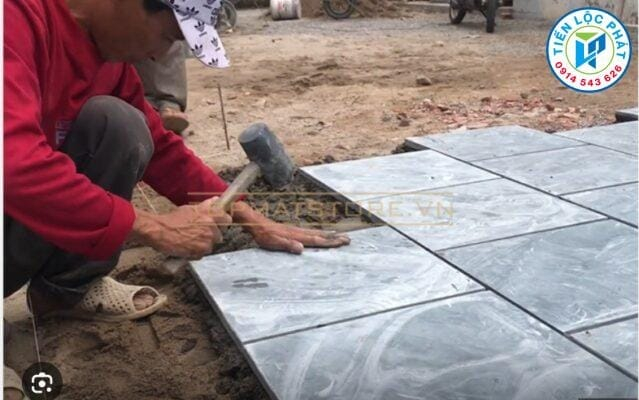 • Trát vữa lên mặt sau của đá, dùng búa cao su đóng xuống theo đúng cao độ hoàn thiện đã xác định từ trước.